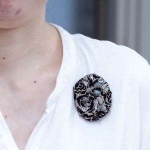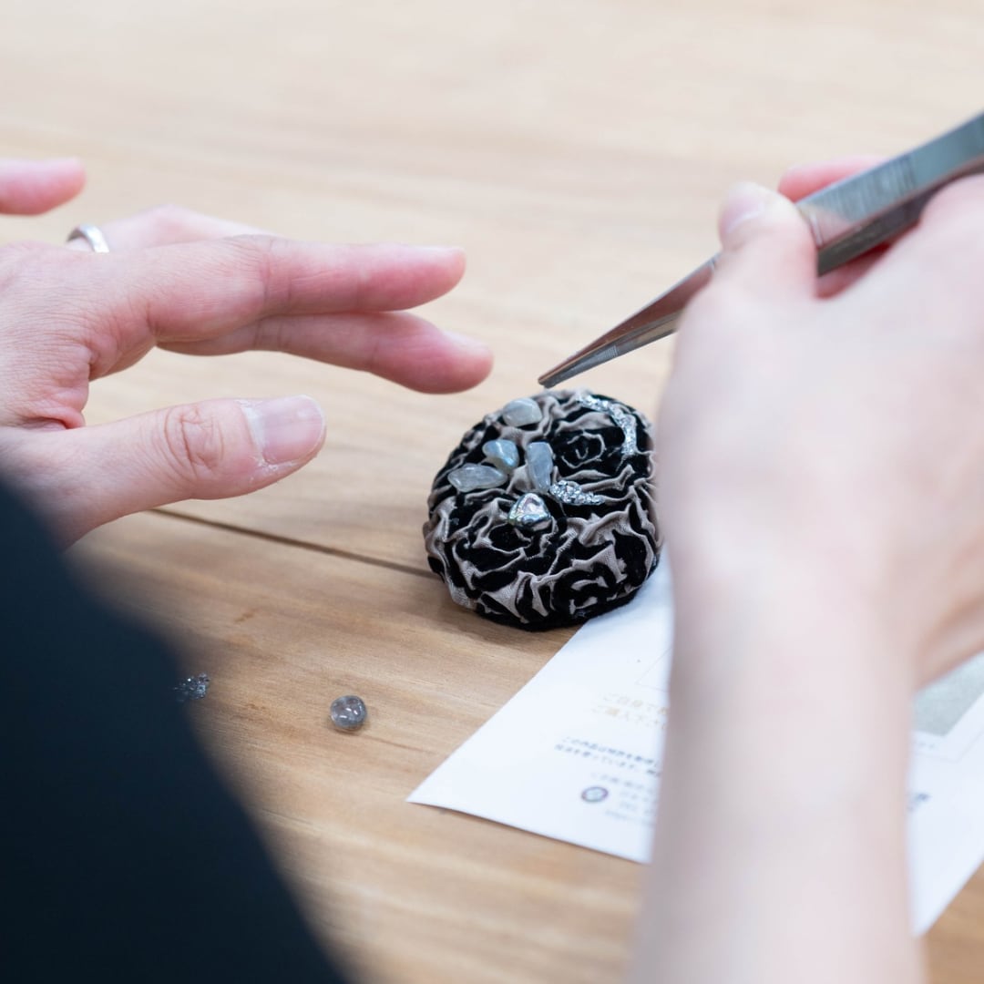 天然石と布やスワロフスキーを組み合わせたブローチが作れるキットです。